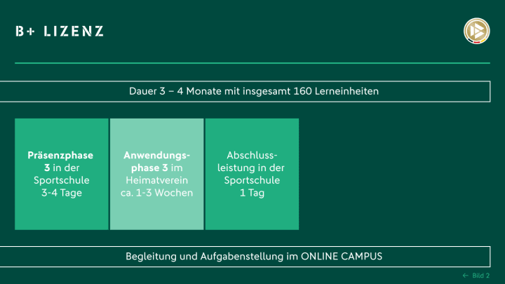 Die B+ Lizenz bereitet durch ihre Schwerpunktthemen die Teilnehmer*innen auf die leistungsbezogene Förderung junger Talente in den Leistungszentren und DFB-Stützpunkten vor.