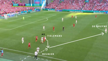 Tielemans erobert den Ball gegen den Außenverteidiger (AV) und passt zu Meunier, der direkt zu De Bruyne ins Zentrum spielt.