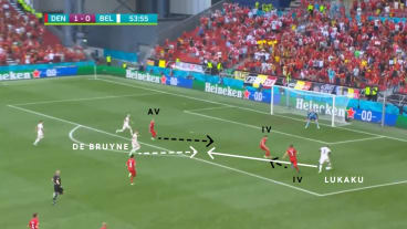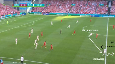 De Bruyne passt mit dem ersten Kontakt zu Lukaku in die Außenspur. Der gegnerische Innenverteidiger (IV; nicht im Bild) antizipiert den Pass frühzeitig, kann diesen jedoch nicht abfangen. Lukaku nimmt nach vorne an und mit und dribbelt im hohen Tempo in Richtung Tor.