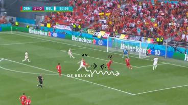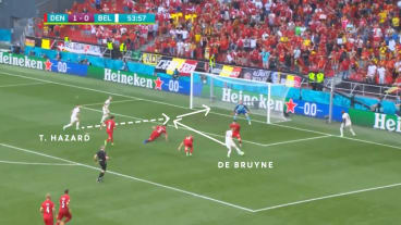 Anschließend behält De Bruyne die Übersicht und passt mit seinem zweiten Kontakt quer zum ballfernen Pfosten, wo Thorgan Hazard als einer von zwei freistehenden Mitspielern verwertet.