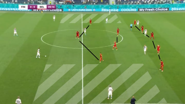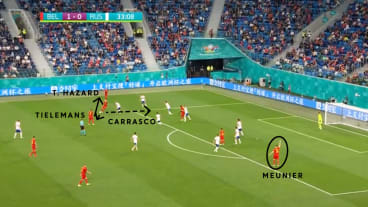 Carrasco passt zu Tielemans und läuft anschließend für einen möglichen Doppelpass in die Tiefe. Tielemans passt jedoch zu Thorgan Hazard in die Außenspur. Gleichzeitig bietet sich Meunier für einen Seitenwechsel an, wobei er außerhalb der Sichtfelder der Verteidiger agiert.
