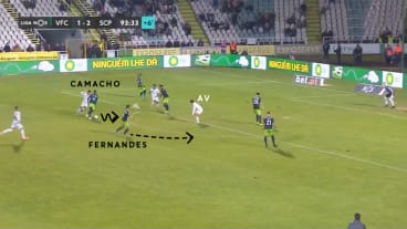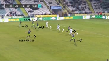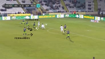 Nach einer Balleroberung kontert Sporting auf das gegnerische Tor. Camacho dribbelt mit hohem Tempo auf die Abwehr zu. Fernandes ist im Rückraum frei und fordert den Ball.