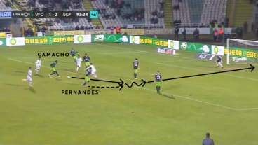 Mit dem Ausspielen übt Camacho erneut Druck auf die Abwehr aus und bindet den Außenverteidiger (AV). Fernandes nimmt die neue Situation wahr und bietet sich mit einem leichten Bogenlauf in der Tiefe an.