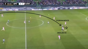 Nach einem Pass von außen ist Fernandes in Ballbesitz. Er blickt sofort in die Tiefe, wo er jedoch keine Anspielstation findet. Gleichzeitig rückt der äußere Mittelfeldspieler (AMF) an ihn heran, weshalb Fernandes mit einem Dribbling fortsetzt.