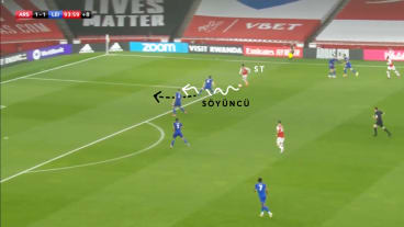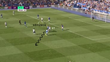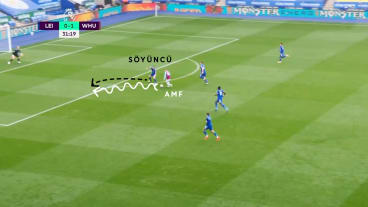 Der zentrale offensive Mittelfeldspieler (ZOM) erhält freistehend den Ball, woraufhin der ballferne äußere Mittelfeldspieler (AMF) in die Tiefe läuft. Söyüncü nimmt die Situation wahr und läuft ebenfalls zum Tor. Der ZOM spielt zum ballnahen AMF, ...