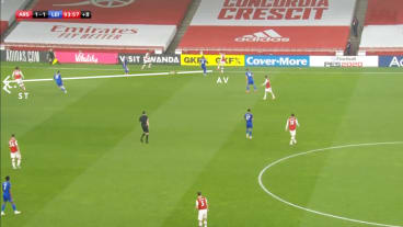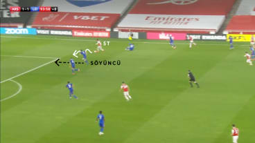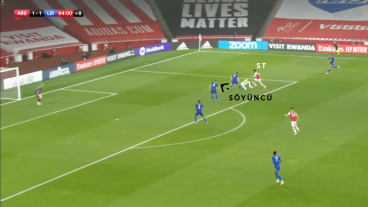 Der ST erläuft das Zuspiel und dribbelt auf Söyüncü zu, der eine Position zwischen Tor und Gegenspieler einnimmt.