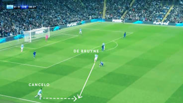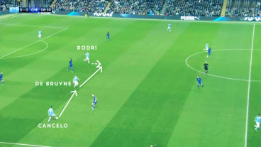 Cancelo passt in die Halbspur auf den nachgerückten De Bruyne, der den Ball auf Rodri weiterleitet.