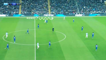 Rodri spielt eine Verlagerung in die linke Außenspur auf den startenden Mendy.