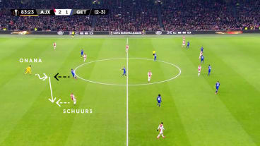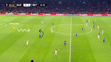 Durch Onanas hohe Positionierung konnten die anderen Mannschaftsteile breit und hoch schieben, sodass Onana einen Diagonalpass in die rechte freie Außenspur spielen kann.