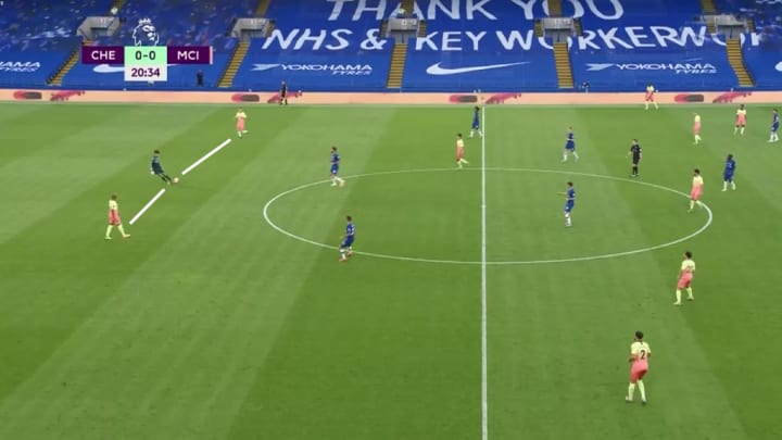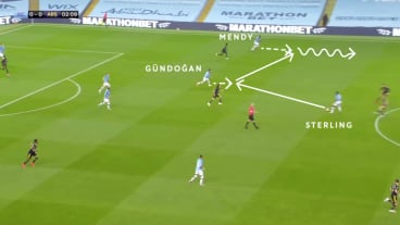 ... auf Sterling, der den Ball im Spiel über den Dritten mit Gündoğan in die linke Außenspur auf Mendy verlagert.