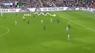- Mit einer plötzlichen Tempoerhöhung dribbelt Doku an seinem Gegenspieler vorbei, dringt in den Strafraum ein, ...