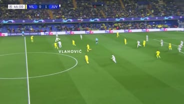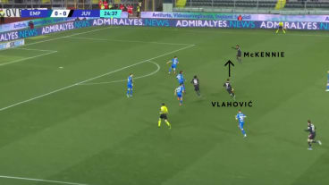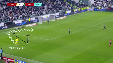 ... und spielt einen hohen Pass hinter die Abwehrkette in den Lauf von Vlahović, ...