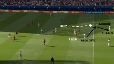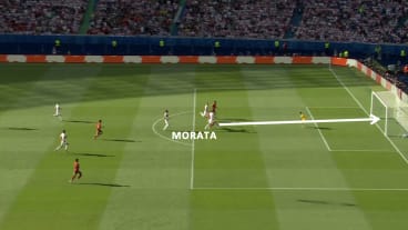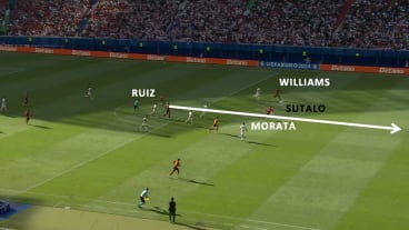 Ruiz spielt einen Schnittstellenpass zu Morata. Sutalo muss zwei Spieler abdecken und reagiert daher zu spät, ...