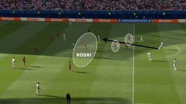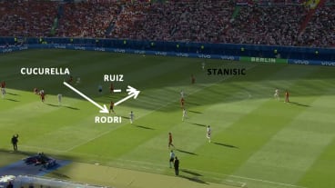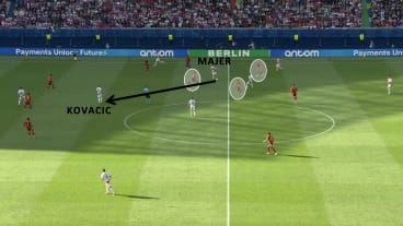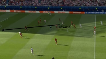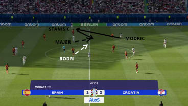 Durch die hohe Position von beiden Achtern, ergibt sich ein großer Raum um Rodri herum, den Kroatien für einen Durchbruch nutzt, ...