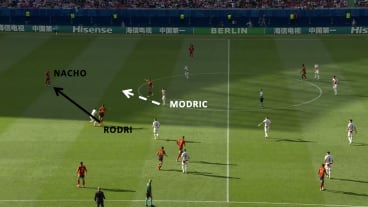 Rodri passt zu Nacho, der von Modric angelaufen wird.