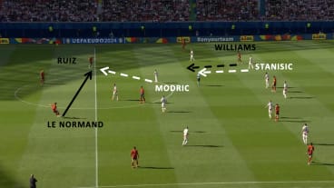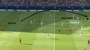 Sutalo muss leicht aufrücken, um Williams in der Halbspur zu decken. Den dadurch entstehenden Raum im Rücken nutzt Nacho für einen Tiefenpass in den Lauf von Williams, ...