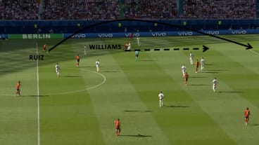 Den dadurch enstehenden Raum im Rücken von Stanisic nutzt Ruiz für einen hohen Tiefenpass in den Lauf von Williams, ...