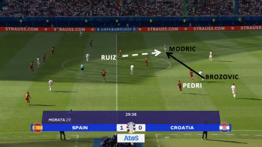 Kroatien presste das 4-4-3 der Spanier im bekannten 4-1-4-1 System – Luka Modric unterstützte Ante Budemir zumeist in der vordersten Linie und presste Spaniens Innenverteidiger Nacho. Den dadurch entstehenden Raum in der Halbspur besetzte Spanien sowohl mit Achter Ruiz als auch mit dem einrückenden Flügelspieler Nico Williams, während Linksverteidiger Mark Cucurella die Breite hielt. Kroatiens Außen- und Innenverteidiger mussten immer wieder rausrücken, um diesen Raum in der Halbspur zu schließen, wodurch sich für Kroatien Zuteilungsprobleme und für Spanien sehr gute Gelegenheiten für hohe Schnittstellenpässe hinter die Abwehrreihe ergaben.