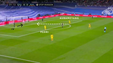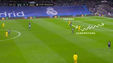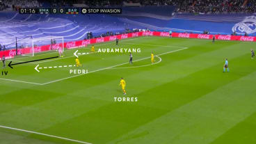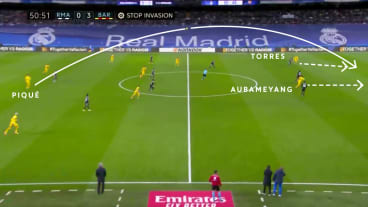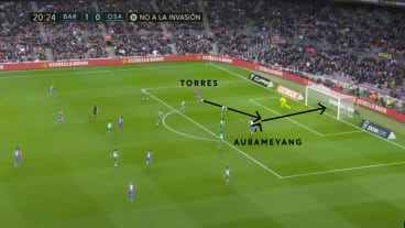 Piqué spielt einen langen Pass in den Lauf von Torres. Zeitgleich startet Aubameyang nach vorne.