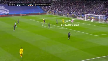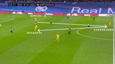 García spielt einen Vertikalpass zu Aubameyang, der auf Busquets klatschen lässt.