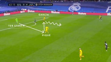 Im Spiel über den Dritten gelangt der Ball über Ter Stegen und Piqué zu García, der nach vorne andribbelt.