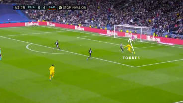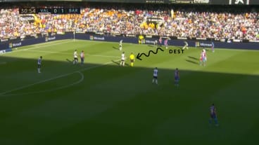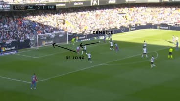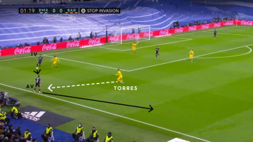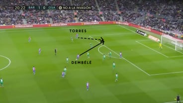 Torres startet einen Tiefenlauf hinter die Abwehrkette und wird von Dembélé mit einem Schnittstellenpass angespielt.