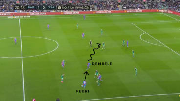 Pedri passt in die rechte Halbspur zu Dembélé, der in die Zentrumsspur andribbelt.