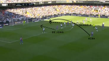 Alba spielt einen Chipball in den Strafraum auf den startenden Dembélé, ...