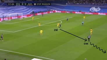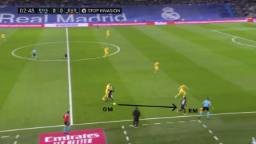 ... und dort den rechten Mittelfeldspieler (RM) in eine gefährliche 1-gegen-1-Situation bringt.