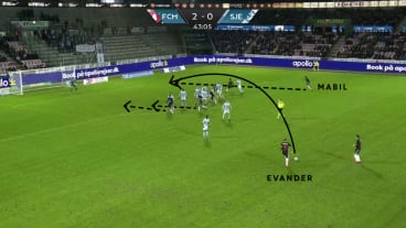 Bei einem Freistoß aus der linken Halbspur setzt sich Mabil in die rechte Außenspur ab, startet von dort aus ungedeckt zum ballfernen Pfosten und wird dort angespielt.