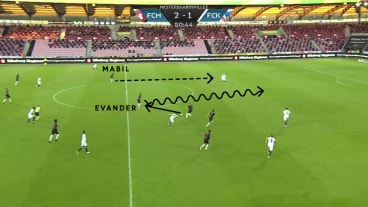 Evander spielt aus der linken Halbspur einen Schnittstellenpass auf Mabil, der gleichzeitig mit Kaba einen Tiefenlauf hinter die gegnerische Abwehr startet.