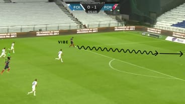 Vibe passt in die linke Außenspur auf Mabil und startet sofort einen Tiefenlauf hinter die gegnerische Abwehr. Mabil dribbelt währendessen nach vorne an.