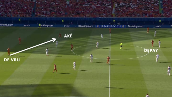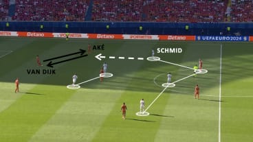 Van Dijk passt zu Aké, der unter dem Druck von Schmid klatschen lässt.