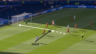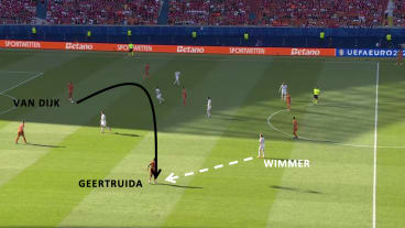 Van Djik spielt einen Flugball zu Geertruida, der sofort von Wimmer angelaufen wird.