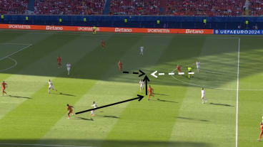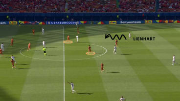 Eine große Stärke der Österreicher ist das offensive Konterspiel. Nach Balleroberung schalten sie blitzschnell um und versuchen, mit möglichst vielen Spielern das gegnerische Tor zu attackieren. Da im Angriffspressing häufig viele Österreicher auf engem Raum agieren, öffnen sich nach Ballgewinn sofort viele Passoptionen vor dem Ball. Diese mutige Spielweise wurde ihnen beim Gegentor jedoch einmal zum Verhängnis: Nachdem sie den Ball zunächst in der rechten Außenspur gewinnen konnten, wurde er anschließend in der Zentrumsspur sofort wieder verloren. Zu diesem Zeitpunkt befanden sich sechs Spieler vor dem Ball und auch Rechtsverteidiger Stefan Posch rückte gerade auf. Im darauffolgenden Konter befand sich die Niederlande in einer 4:3-Überzahl, die sie zum zwischenzeitlichen Ausgleichstreffer nutzen konnten.