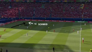 Der Torhüter passt zu Aké, der von Schmid angelaufen wird.