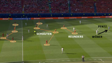 Wöber passt zu Pentz. Die Niederlande verteidigt im 4-4-2, wobei Schouten seine Position nach vorne verlässt.
