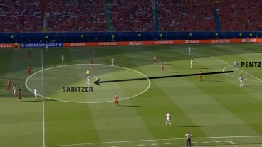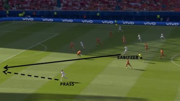 Den dadurch entstandenen Raum in der Zentrumsspur nutzt Pentz für einen linienbrechenden Pass zu Sabitzer, ...