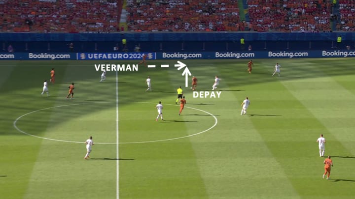 Gegen den Ball agierten die Niederländer von der Struktur her ähnlich: Auch Tijjani Reijnders schob als Pendant zu Marcel Sabitzer im Pressing in die vorderste Linie, sodass sich ebenfalls eine mannorientierte 4-4-2-Grundordnung ergab. In den Momenten, in denen einer der beiden Achter, Jerdy Shouten oder Joey Vermeer, zusätzlich nach vorne schob, gab die Niederlande jedoch viel Raum in der Halbspur frei, den die Österreicher beispielsweise vor dem 1:0 Treffer ausnutzten. Diesen Raum gab es zwar auch im Pressing von Österreich – dort wurde er jedoch im Notfall von einem herausrückenden Innenverteidiger zugelaufen.