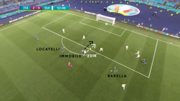 Es entsteht ein Schnellangriff im 3 gegen 3 mit dem ballführenden Locatelli sowie Barella und Insigne, die in die Tiefe sprinten. Das angedachte Zuspiel zu Insigne ist jedoch zu ungenau und wird vom IV abgefangen.