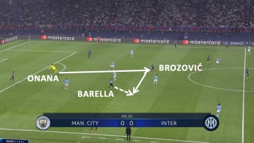 Onana spielt einen Vertikalpass auf Brozović, der in den Lauf von Barella klatschen lässt.