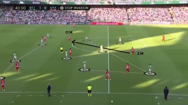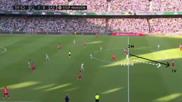 Der gegnerische zentrale Mittelfeldspieler (ZM) passt zum Innenverteidiger (IV). Dieser wird von Fekir angelaufen.