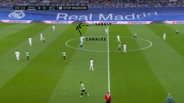 Der gegnerische ZM nutzt den freien Raum zwischen Abwehrkette und Mittelfeld bei Betis aus und spielt einen Vertikalpass auf den offensiven Mittelfeldspieler (OM).