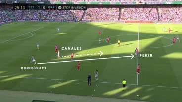 Rodríguez spielt einen Vertikalpass zu Fekir. Canales startet mit dem Pass einen Tiefenlauf, ...