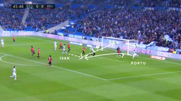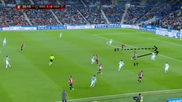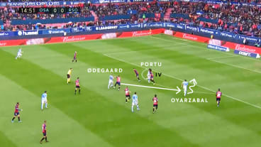 Ødegaard dribbelt diagonal auf die Abwehrreihe zu, woraufhin der ballnahe Innenverteidiger (IV) herausrückt. Gleichzeitig bietet sich Portu mit einem Lauf in die Tiefe an, während Oyarzabal im Rücken des herausgerückten IVs stehen bleibt.