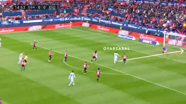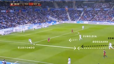 Daraufhin kommt Ødegaard entgegen, der jedoch mit dem zentralen defensiven Mittelfeldspieler (ZDM) einen Gegner im Rücken hat. Elustondo passt zu Ødegaard, der auf Zubeldia klatschen lassen möchte.