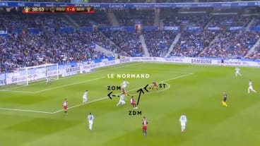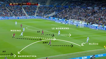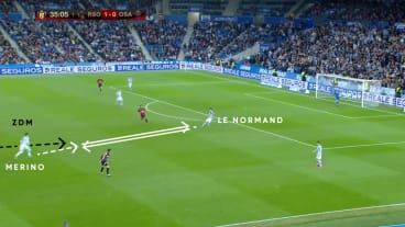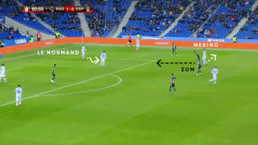 Le Normand nimmt die Situation wahr und orientiert sich nach innen, woraufhin der ZOM seinen Laufweg anpasst. Dadurch vergrößert sich das Passfenster zu Merino, den er auch anspielt. Der zentrale defensive Mittelfeldspieler (ZDM) folgt dem Pass und übt Druck auf Merino aus.
