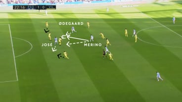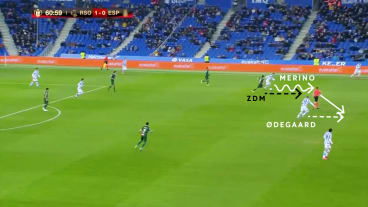 Merino dreht zwischen den Linien auf, woraufhin José diagonal hinter die Abwehr läuft. Doch Merino passt zu Ødegaard, der mit einem diagonalen Dribbling fortsetzt. Das Dribbling bindet und verengt die gegnerische Abwehr.