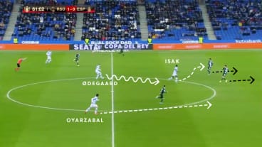 Ødegaard setzt das Spiel fort und dribbelt mit Tempo auf die gegnerische Abwehr zu. Oyarzabal und Isak unterstützen und bieten sich außerhalb der Abwehrreihe an.