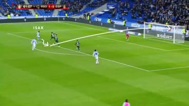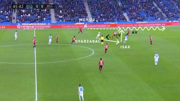 Le Normand passt zu Merino, der das Spiel aufgrund seiner Vororientierung schnell fortsetzen kann und direkt zu Oyarzabal in den Raum zwischen den Linien spielt.